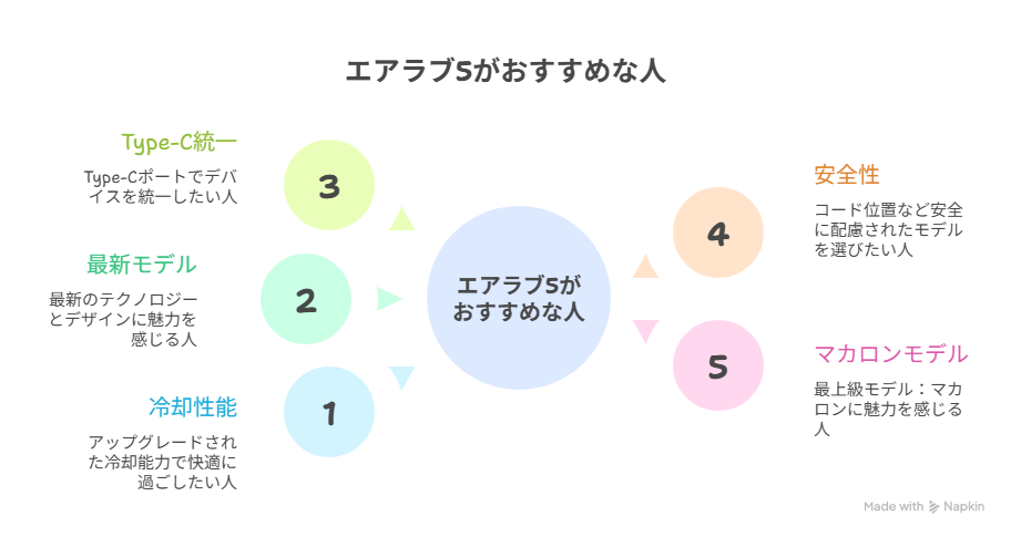 風量強化、コード位置、安全性向上、Type-C対応などエアラブ5は細かな部分までアップデートされています。